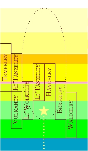 Die Domänen sind hier noch detaillierter angeführt, wenngleich sie ineinander übergehen und sich nur die sinnliche von der übersinnlichen Welt durch den Feuerring (rosa Linie) einander abgrenzen lassen.